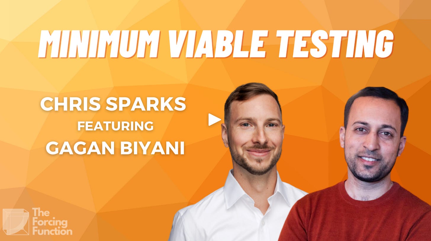 Forcing Function Hour, from poker pro turned life coach Chris Sparks’ org Forcing Function, is not a typical startup podcast. It has poker players, productivity gurus but also the occasional Silicon Valley types. This episode featured Gagan Biyani, cofounder of edtech co Udemy, and now Maven, which helps creators set up and offer cohort-based courses. Gagan talks about Minimum Viable Testing, a framework for validating startup ideas, that he envisions as a precursor to the Minimum Viable Product.